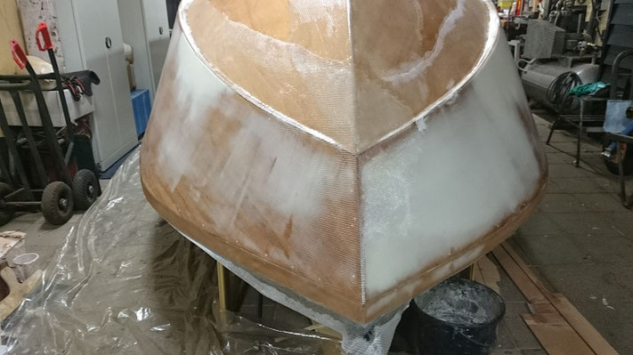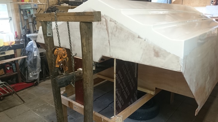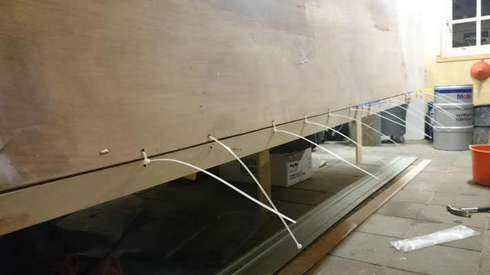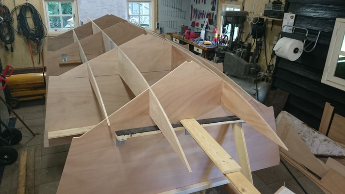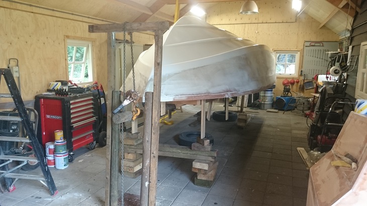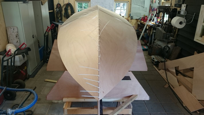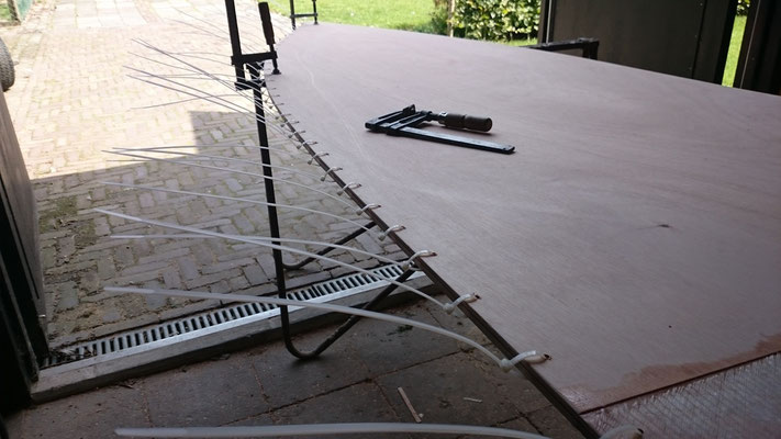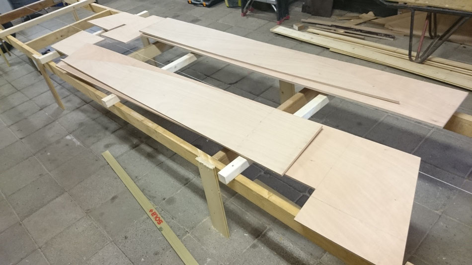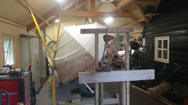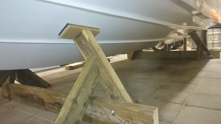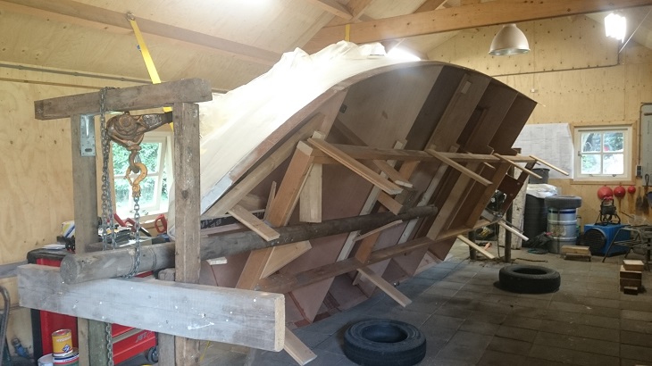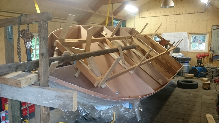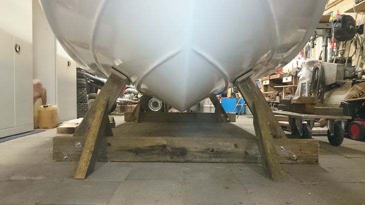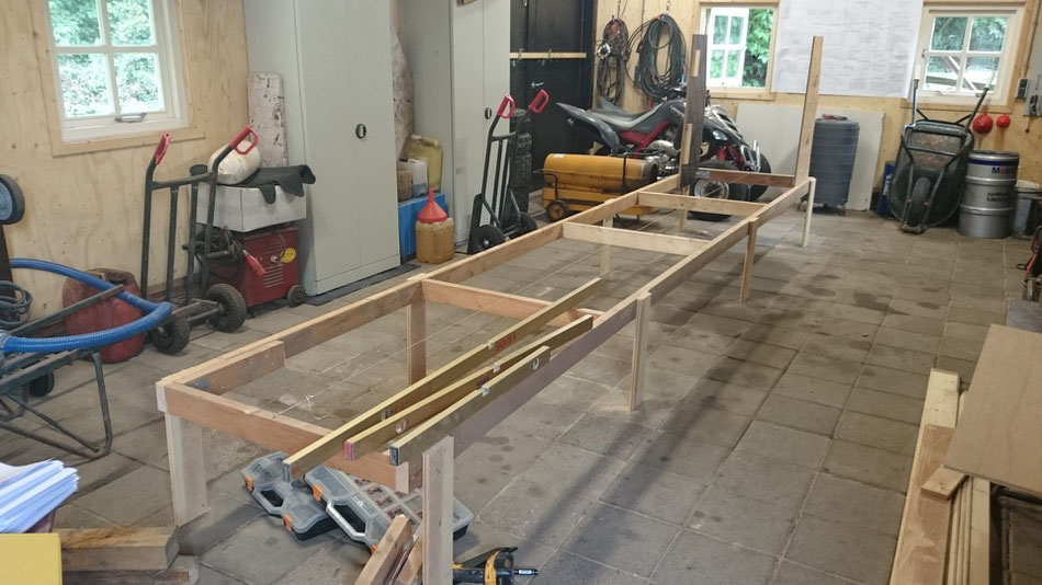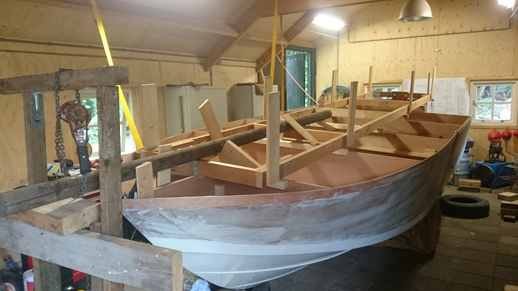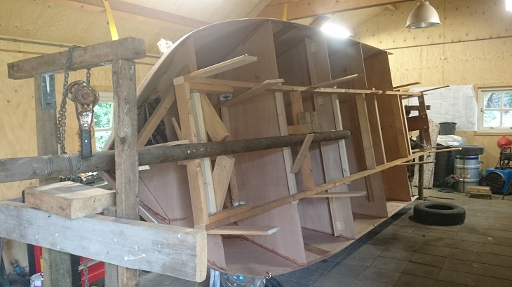 De boot gaat ondersteboven gebouwd worden. Om alles tijdens de bouwfase bij elkaar te kunnen houden, wordt dit op een frame bevestigd. Dit frame exact op maat en waterpas afgesteld.