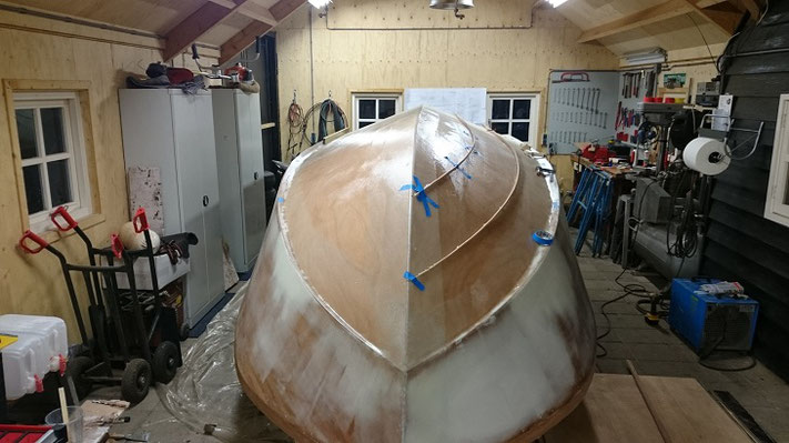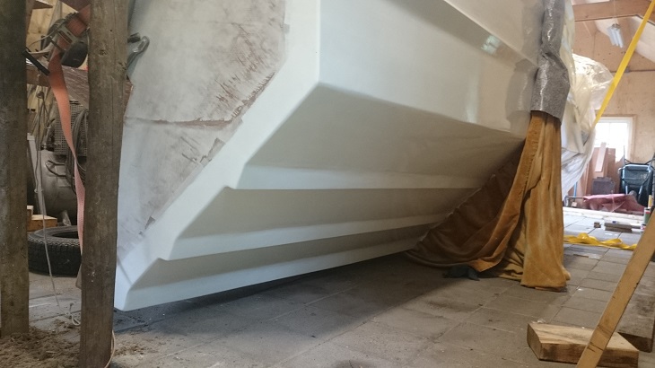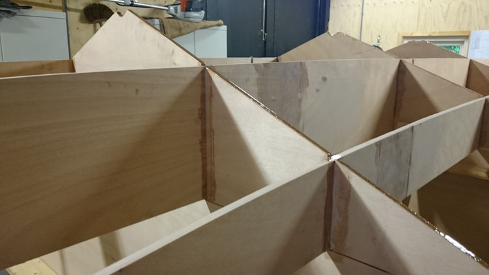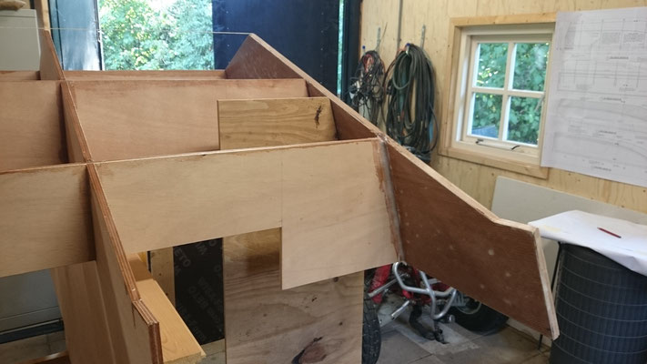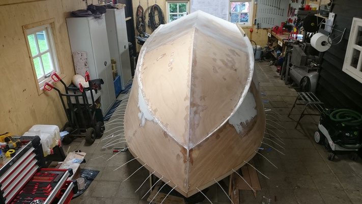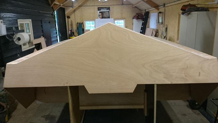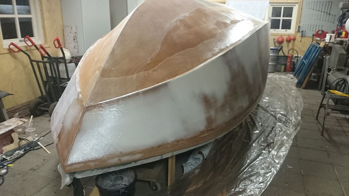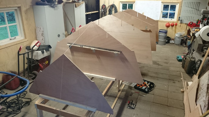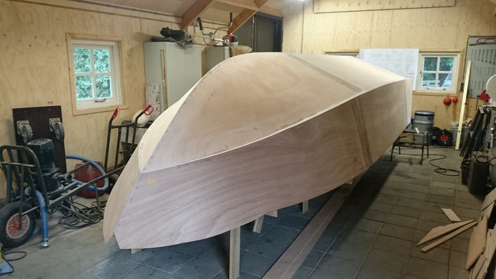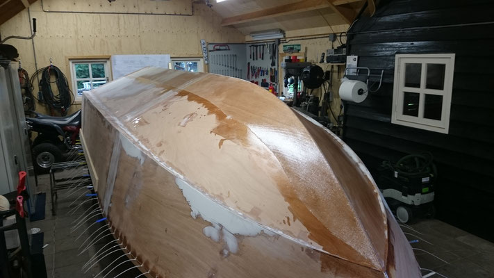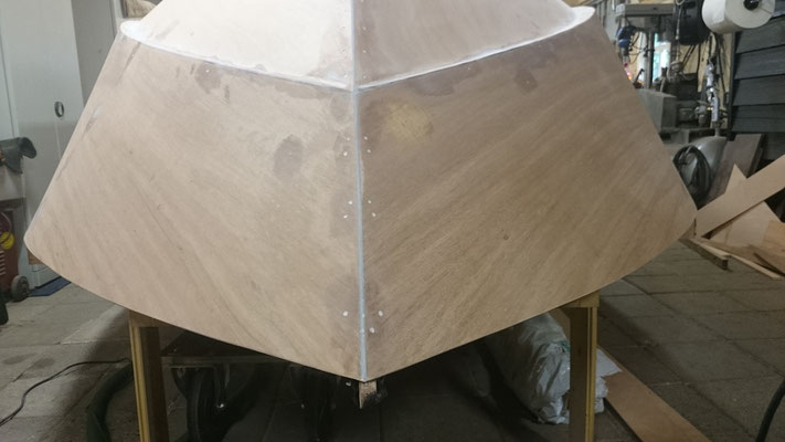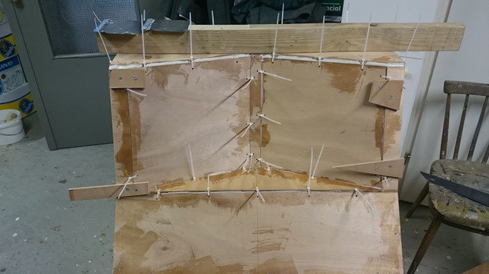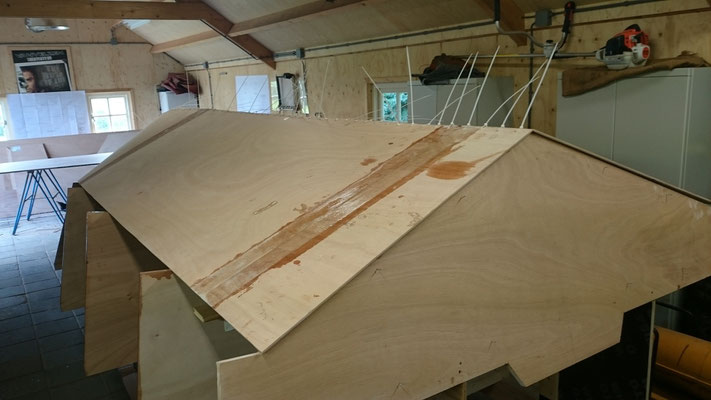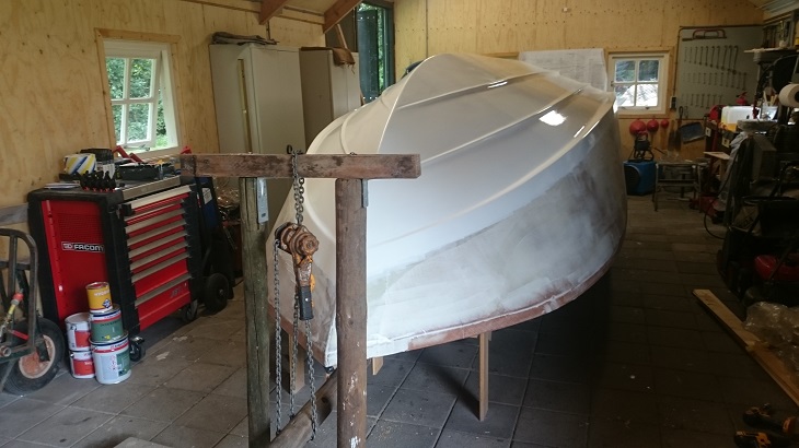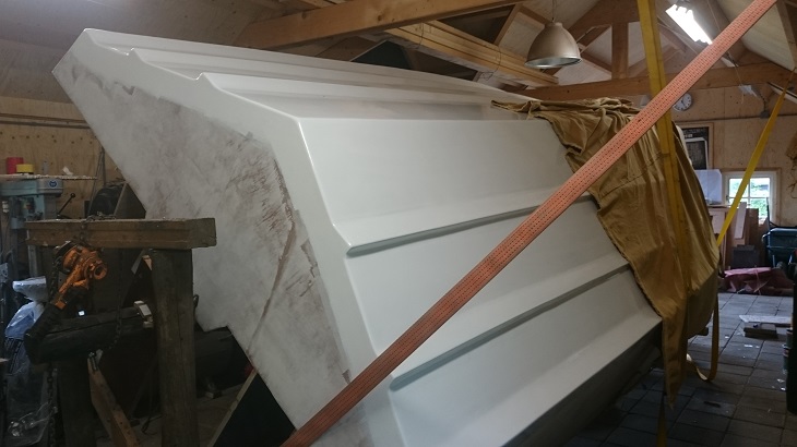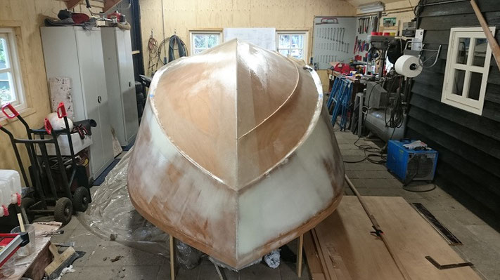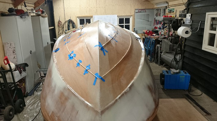 De boot gaat ondersteboven gebouwd worden. Om alles tijdens de bouwfase bij elkaar te kunnen houden, wordt dit op een frame bevestigd. Dit frame exact op maat en waterpas afgesteld.